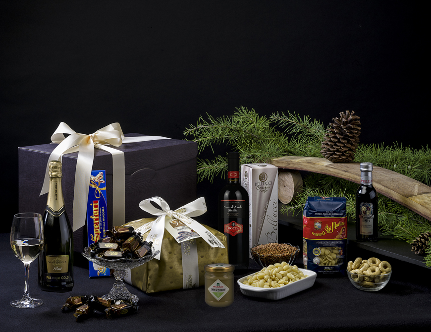 L'elegante scatola regalo sarà fornita preferibilmente nella colorazione DORATA come in foto; in caso di esaurimento scorte, verrà sostituita con altre colorazioni. I prodotti sopra indicati sono quelli effettivamente contenuti nel cesto, tranne rari casi nei giorni prima del Natale dove eventuali articoli terminati saranno sostituiti con prodotti di pari valore; la foto è indicativa della tipologia di assortimento della confezione